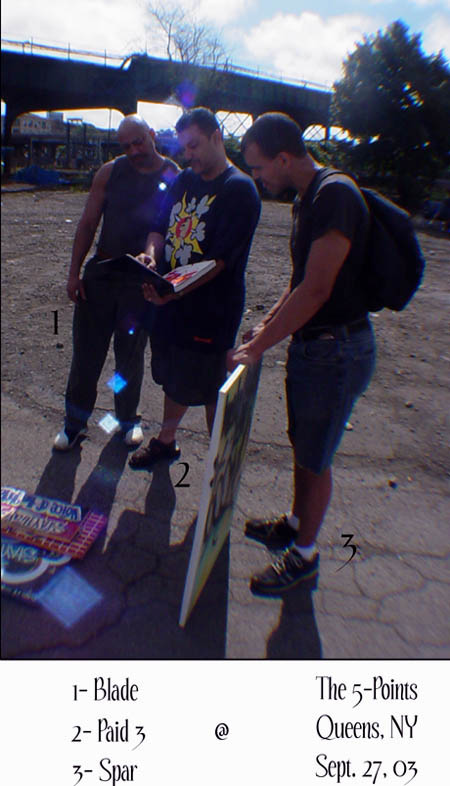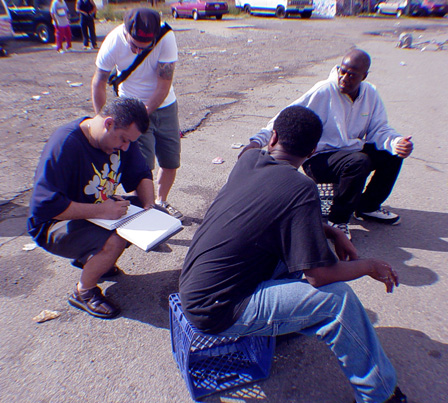 PAID3 does a quick out line in ZEPHYR's black book as LIL SOUL and OO 1 look on. |