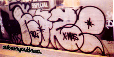 Throw-Ups The history of the "throw-up" started with writers in the 70's doing quick "bubble-letter" pieces to "get-up" fast. The first writer and crew to take this form of "bombing" to a new level was, IN-1 & THE TOP CREW. Their goal was to take over the whole subway system. They accomplished this by inventing the two-letter throw-up which helped them become "All-city" kings in the mid 1970's. Many writers used this concept and took it to a new level. Originality is also very important and writers could be criticized for having a "whack" "throwie" |
