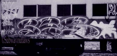 SE 3 aka HAZE. This throw up was hard to many who did not know him to read. But HAZE had one of the best looking throw up in history. He started in the early on Broadway, writing with MALTA, PAX and a few others. In the 1980s he returned with the group RTW, those years would become the biggest of his career as a Subway Bomber |
